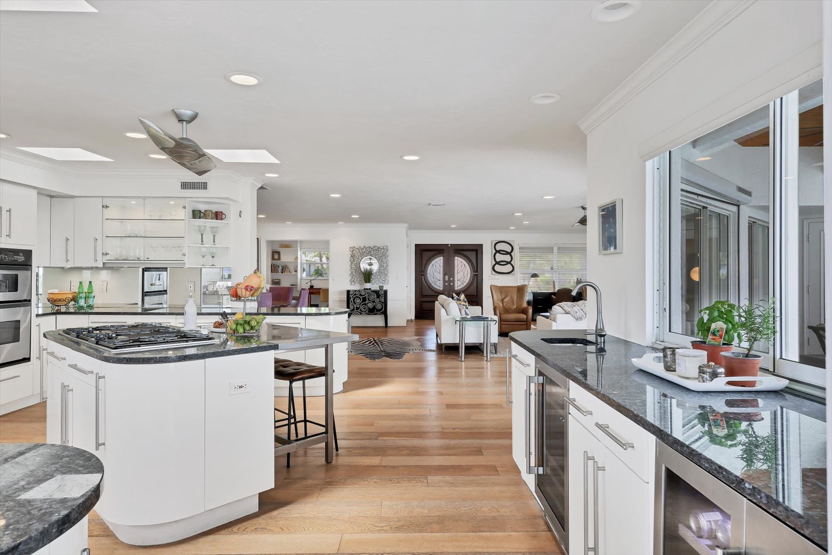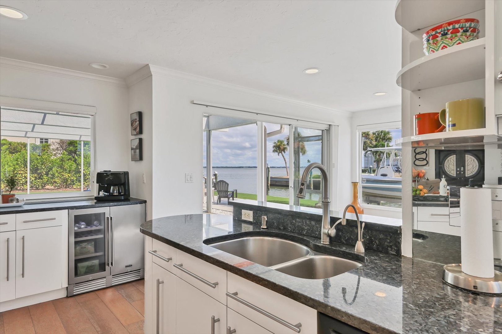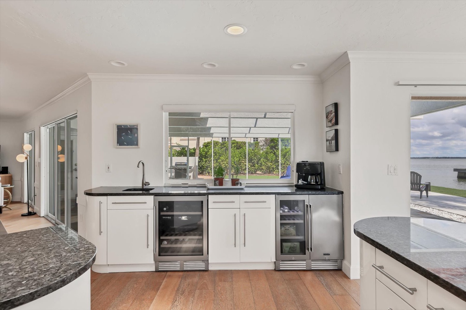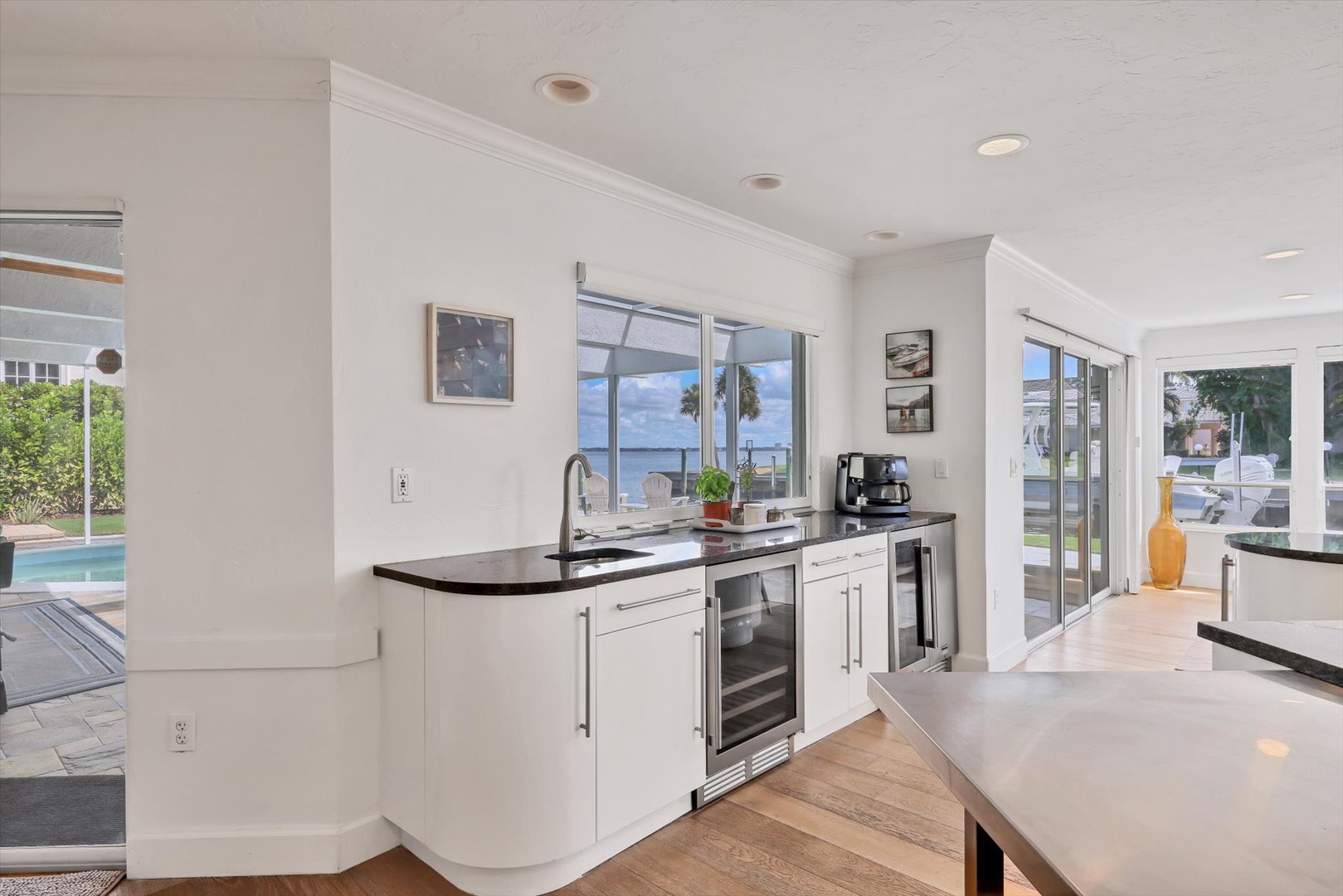 The kitchen offers a large center island with its gas cooktop. This kitchen is fully equipped with all necessities plus more. The wet bar offers a great view of the pool and bay where you can chill your favorite beverage. Make your cup of java to start your day while enjoying the views.