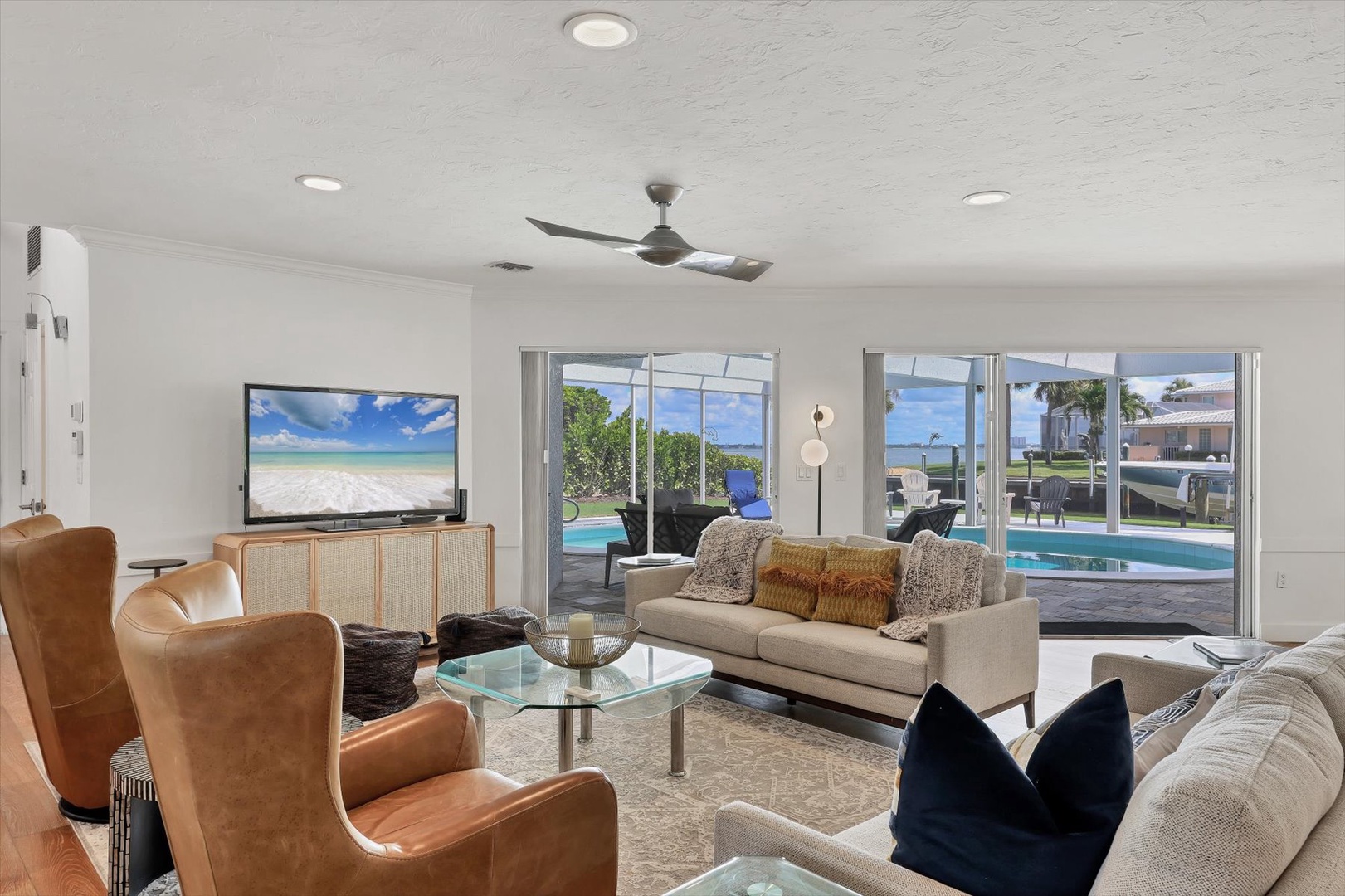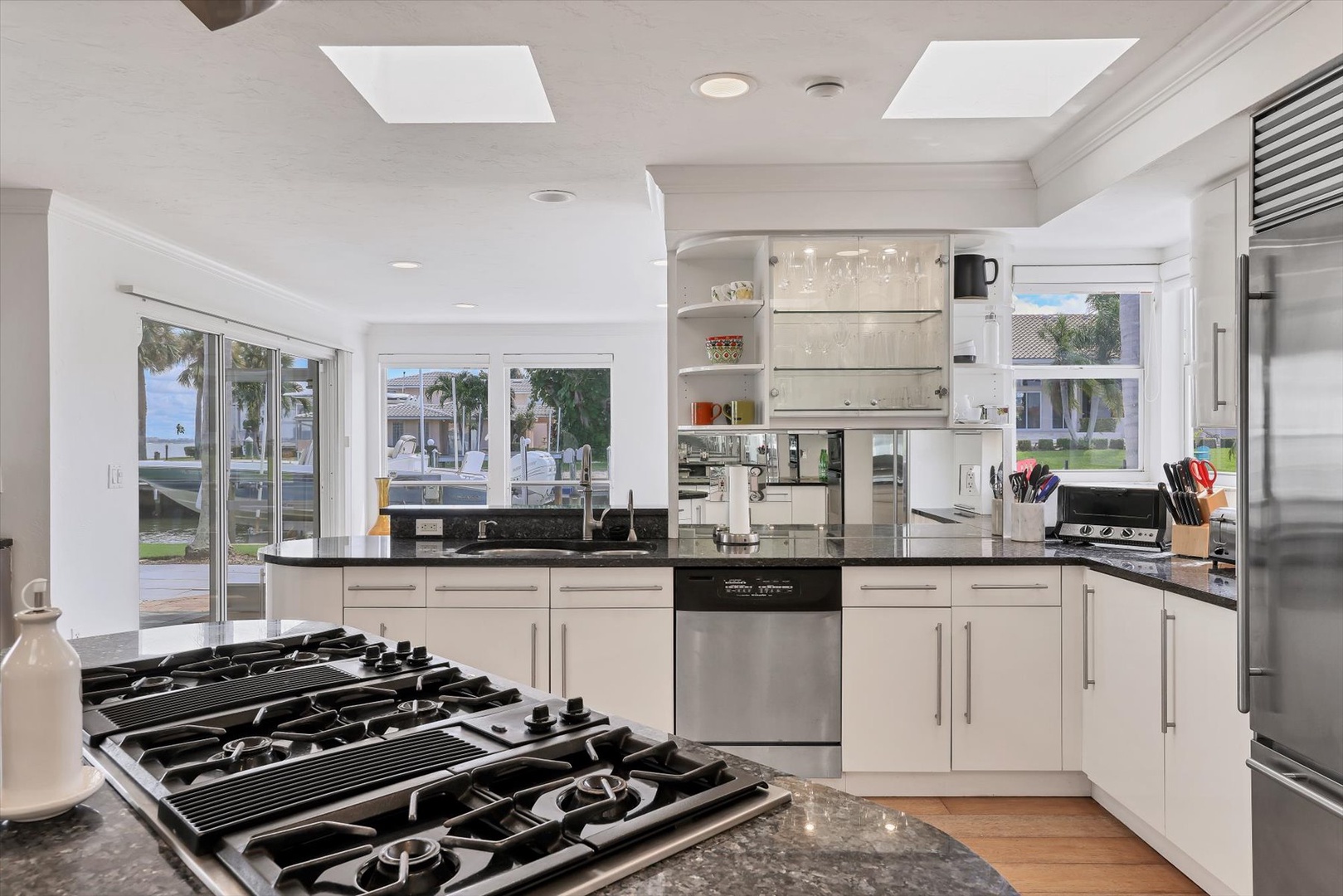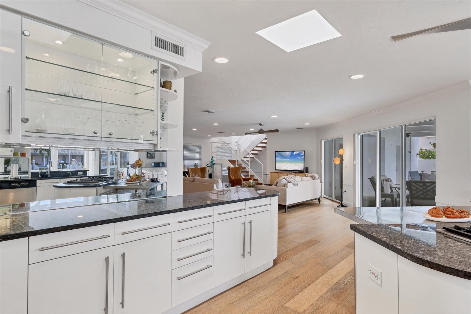 The kitchen offers a large center island with its gas cooktop. This kitchen is fully equipped with all necessities plus more. The wet bar offers a great view of the pool and bay where you can chill your favorite beverage. Make your cup of java to start your day while enjoying the views.