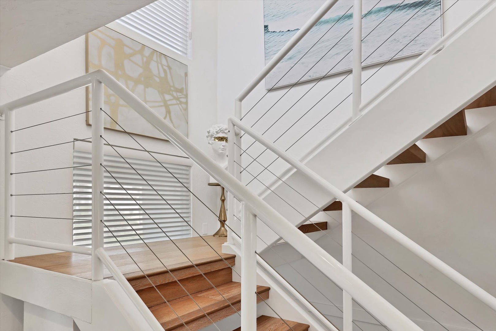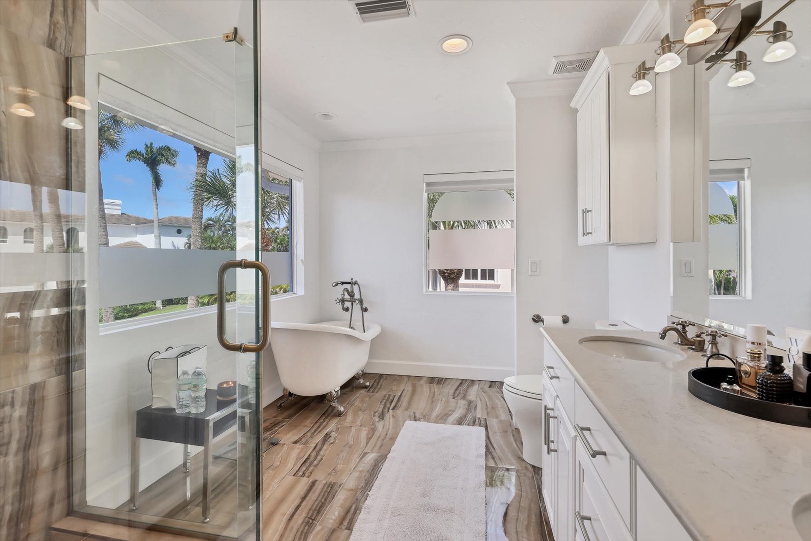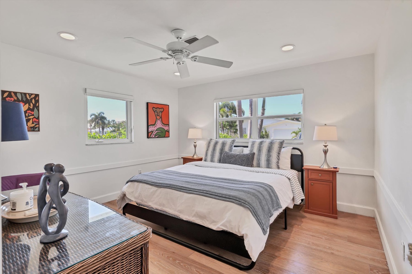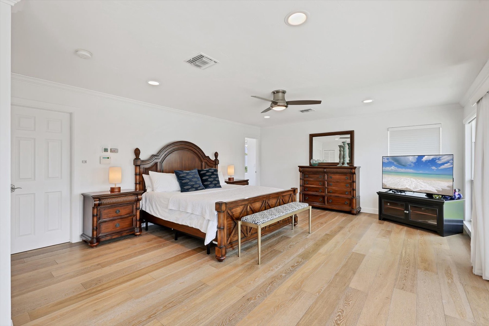 As you climb the stairs to your master suite, will decompress from the day when you reach the top and see the water views. Sit on the deck and watch the boats or water life go by. Your ensuite bath offers a step in shower or relax in the free standing lion-footed tub. A new master bedroom king mattress was installed March 2023.
