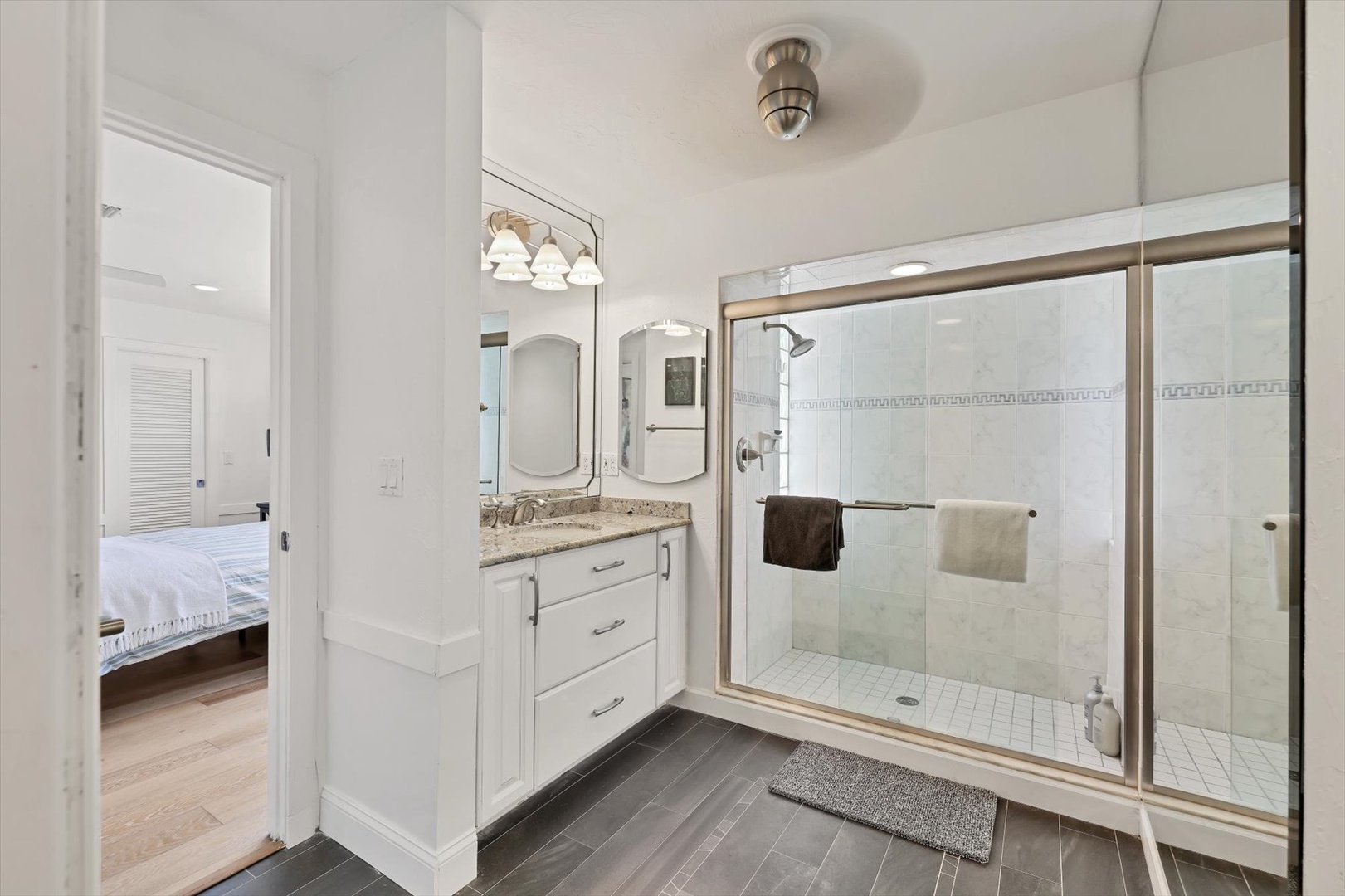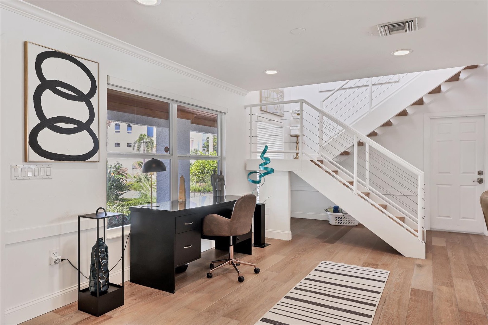 Two guest bedrooms on the west side of the home on the ground floor share a large full bath with walk-in shower. The 4th bedroom has been set up as an office space with a pull out sleeper sofa for overnight guests. Work from home in the office or just relax reading your favorite literature.