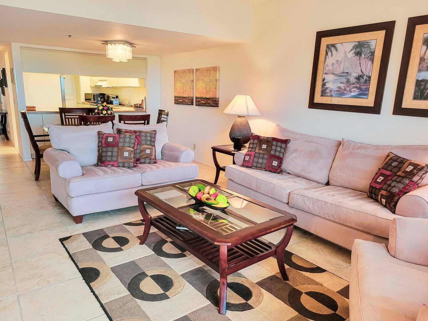 Step inside to a bright, open living space designed for relaxation. The private balcony invites you to unwind with morning coffee or evening cocktails while enjoying gentle sea breezes and picture-perfect sunsets. The fully equipped kitchen makes meal prep a breeze, and the dining area is ideal for both casual breakfasts and family dinners.
