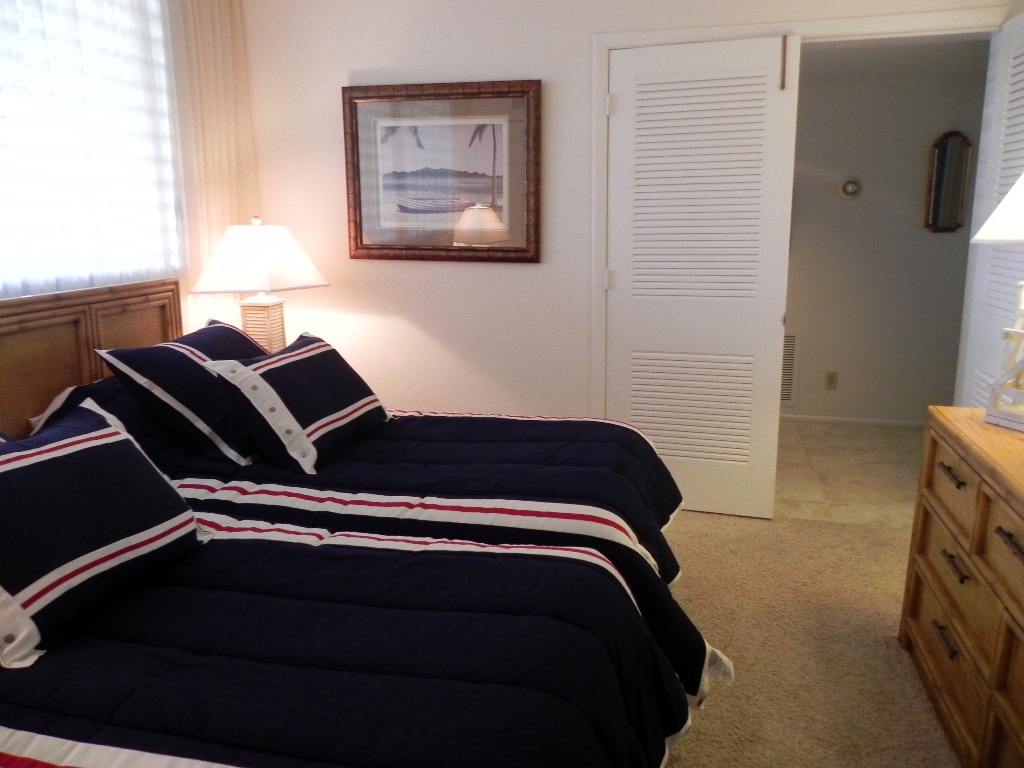 The spacious primary suite features a king-sized bed, en-suite bath, and direct access to the lanai—perfect for waking up to tranquil water views. The guest bedroom offers two comfortable twin beds, making this a great option for families or friends traveling together.