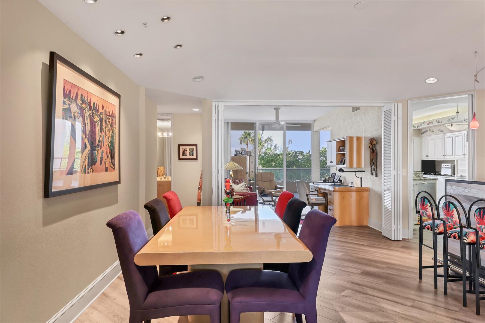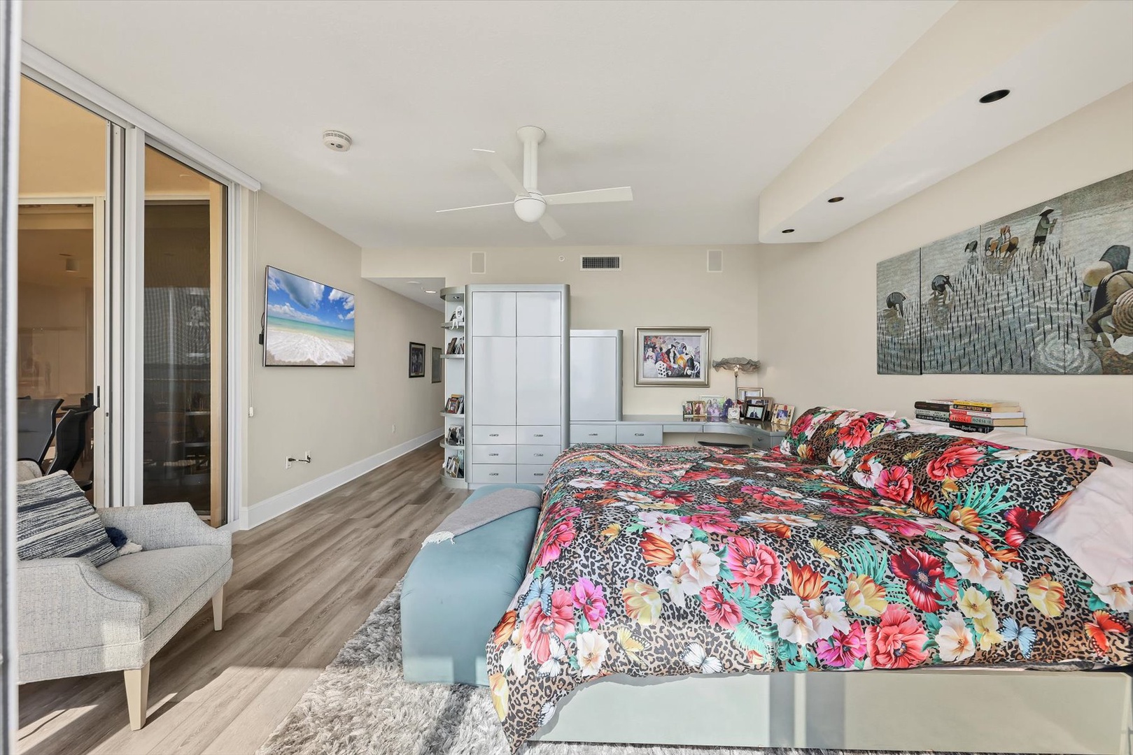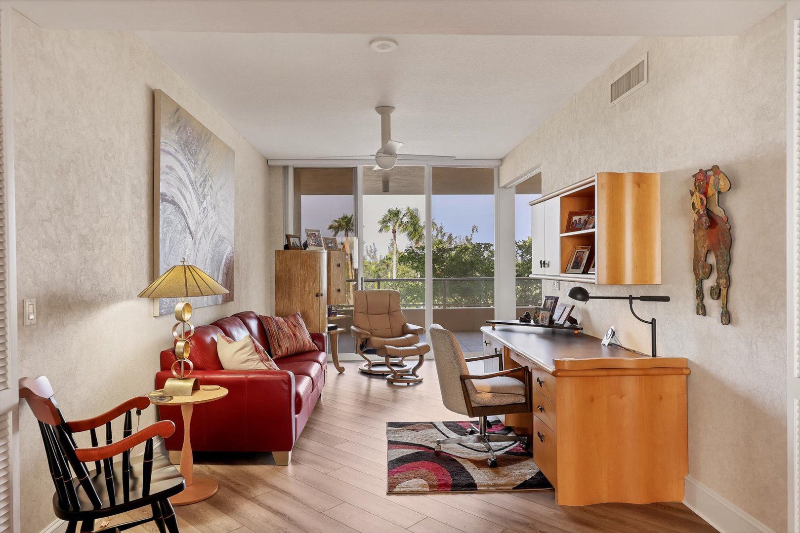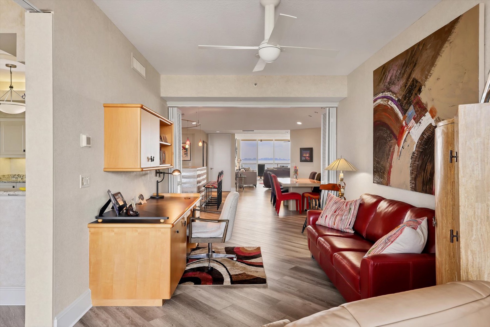 Both bedroom suites feature king beds, ensuite baths, and terrace access, creating two private sanctuaries. The third bedroom is set up as an office, perfect for working remotely or enjoying quiet time with a book.