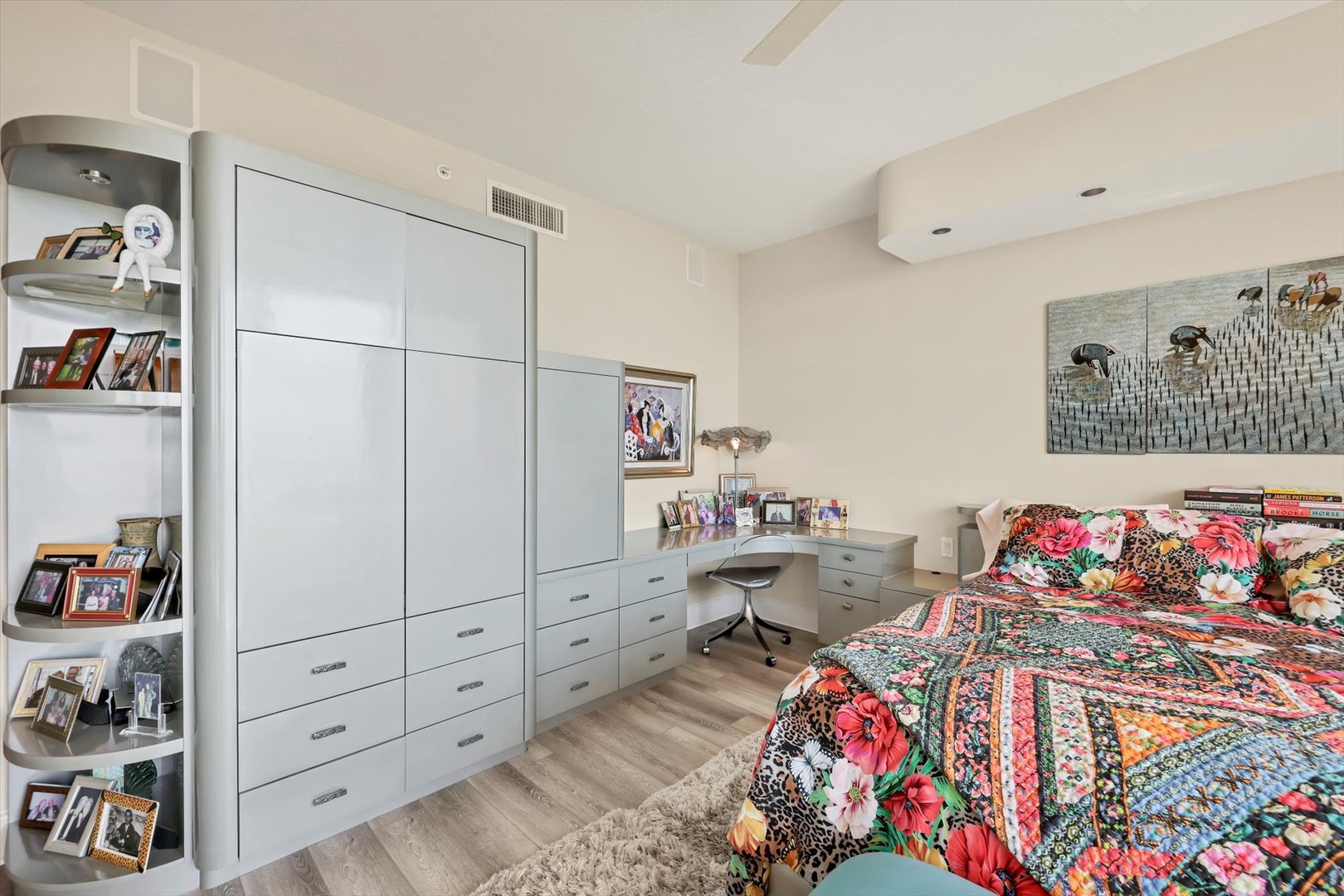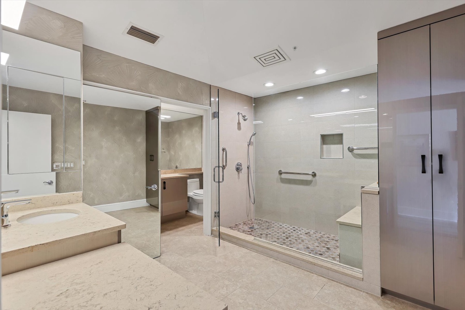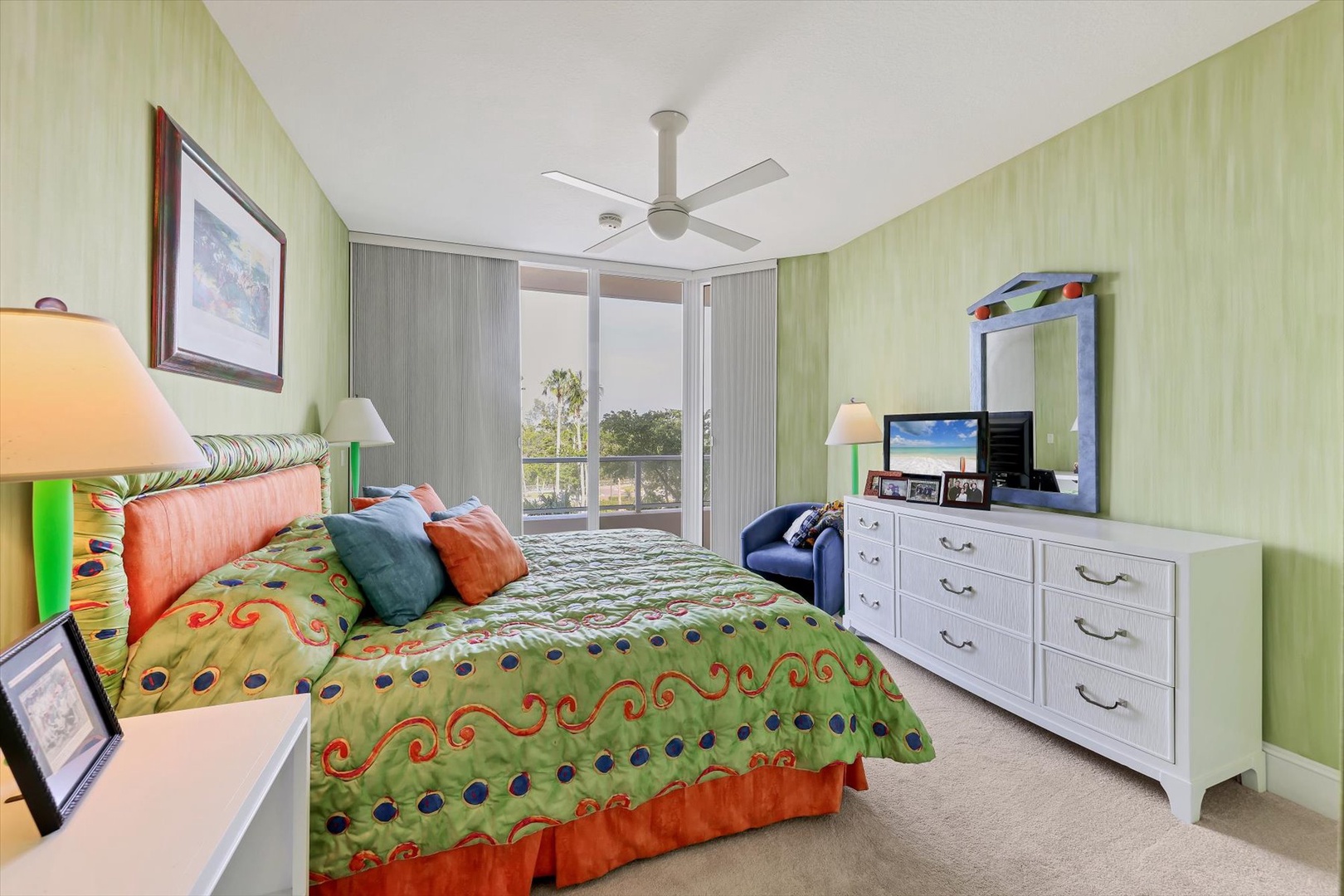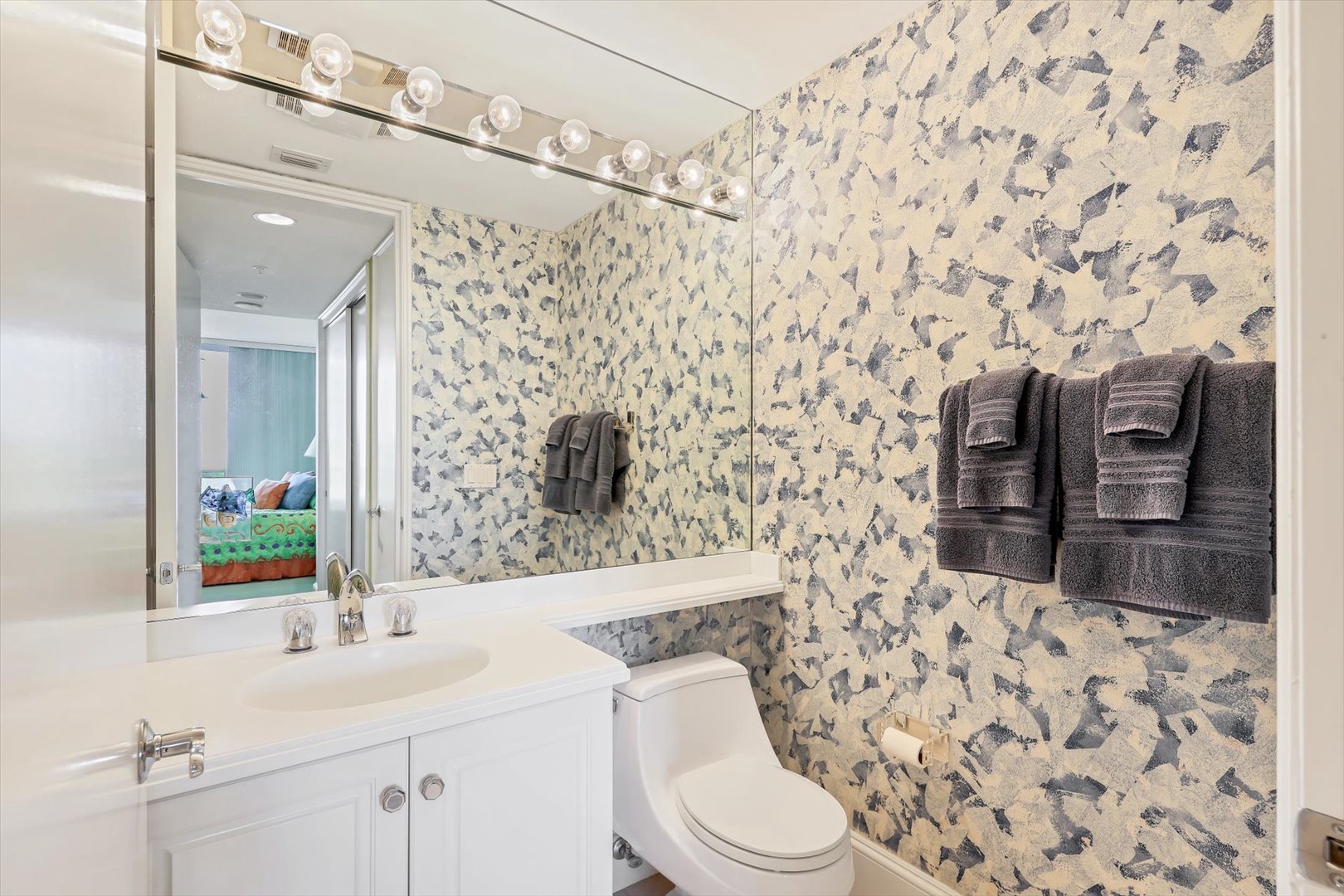 Both bedroom suites feature king beds, ensuite baths, and terrace access, creating two private sanctuaries. The third bedroom is set up as an office, perfect for working remotely or enjoying quiet time with a book.