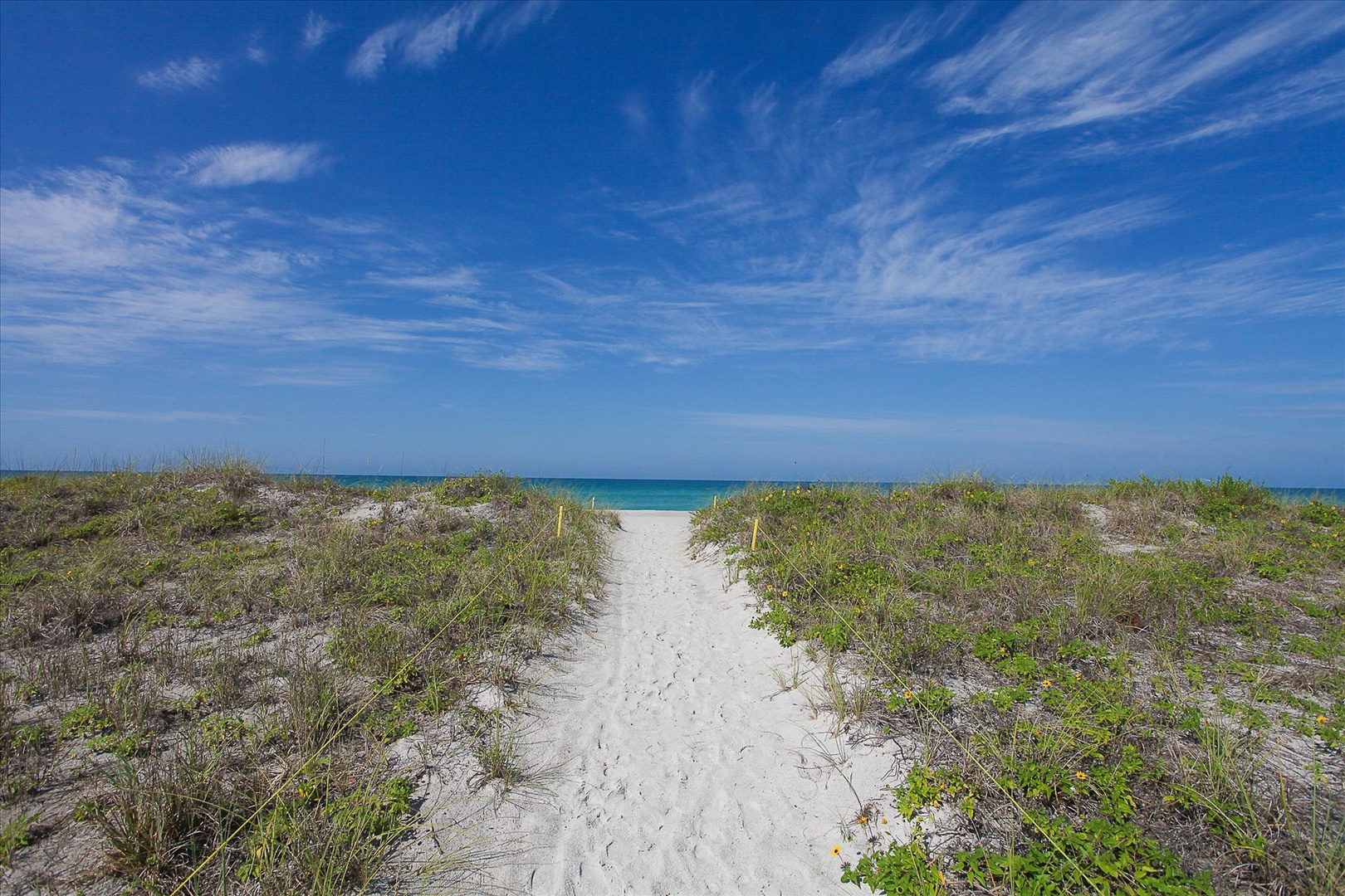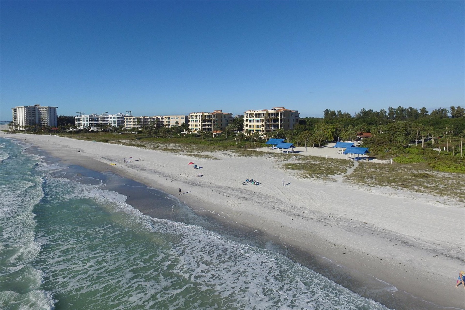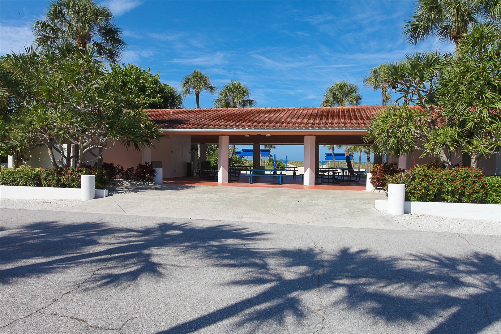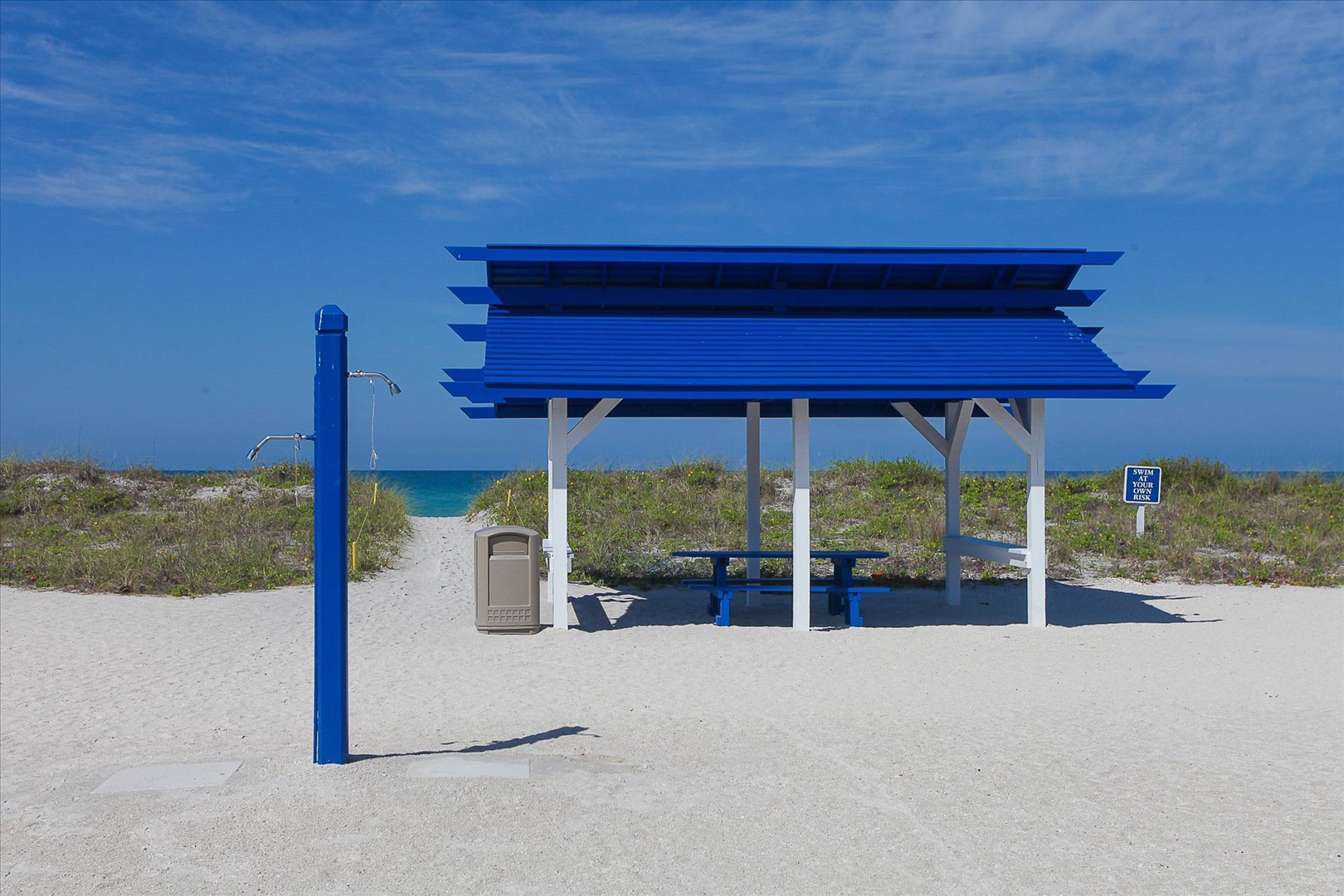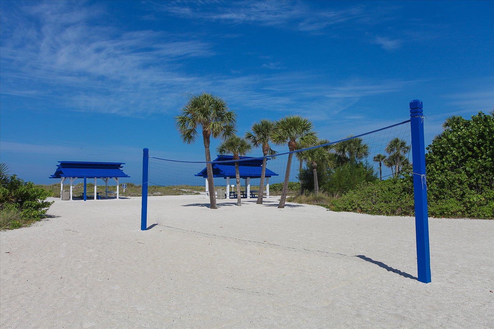 -Deeded private beach access at the Bay Isles Beach Club, with lounge chairs, tiki huts, grills, and restrooms