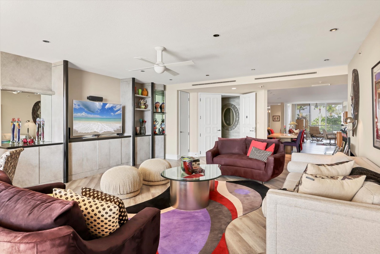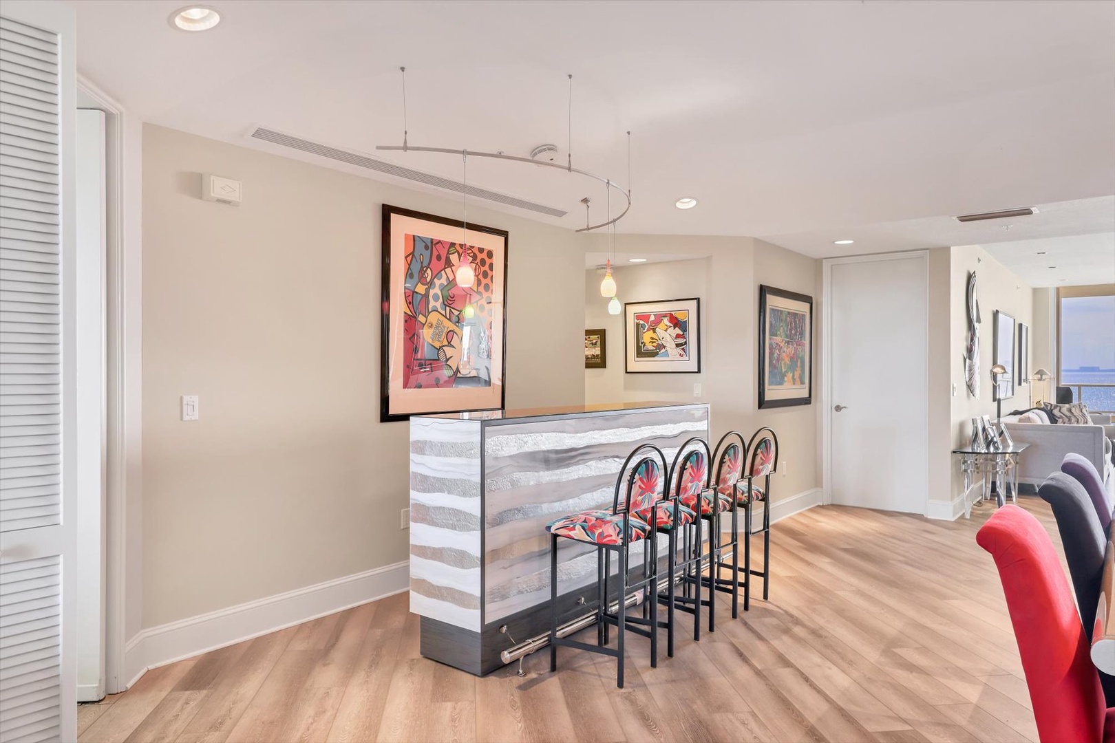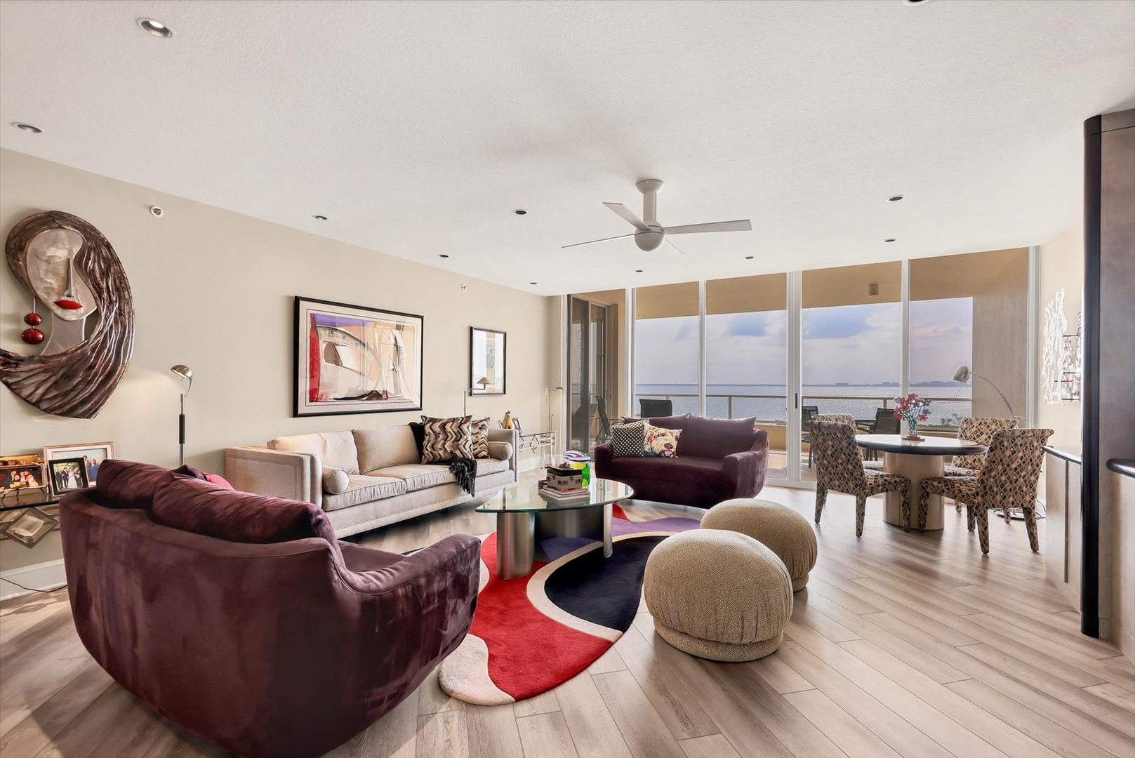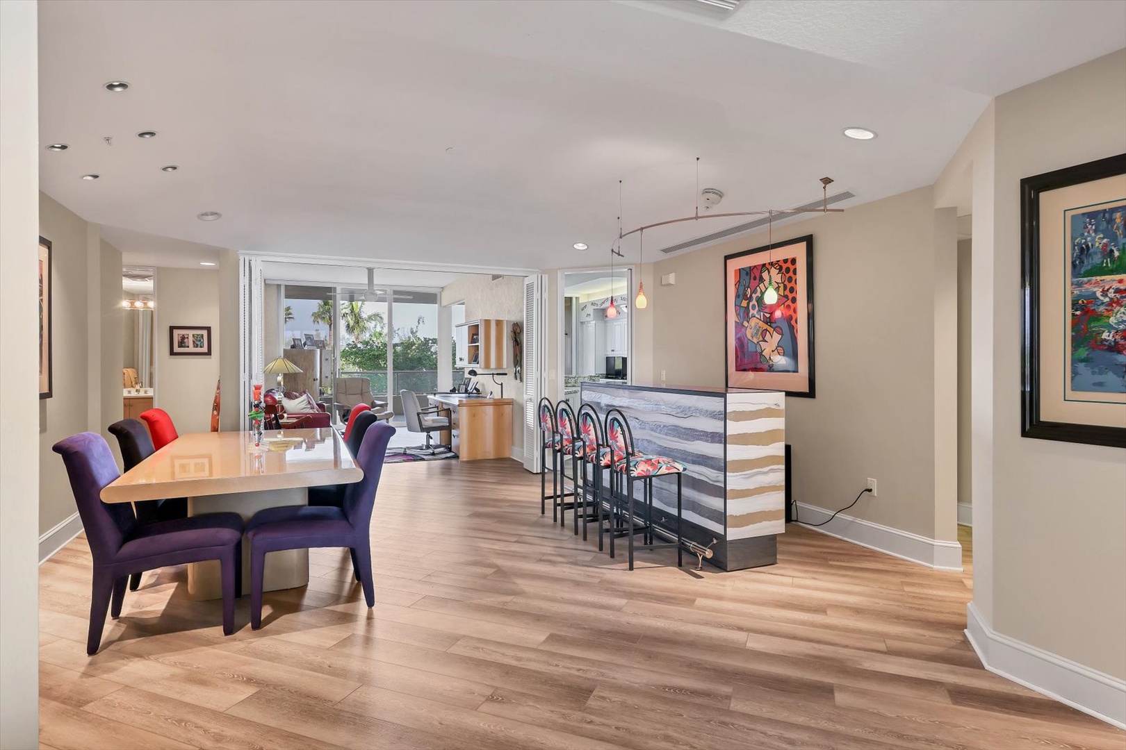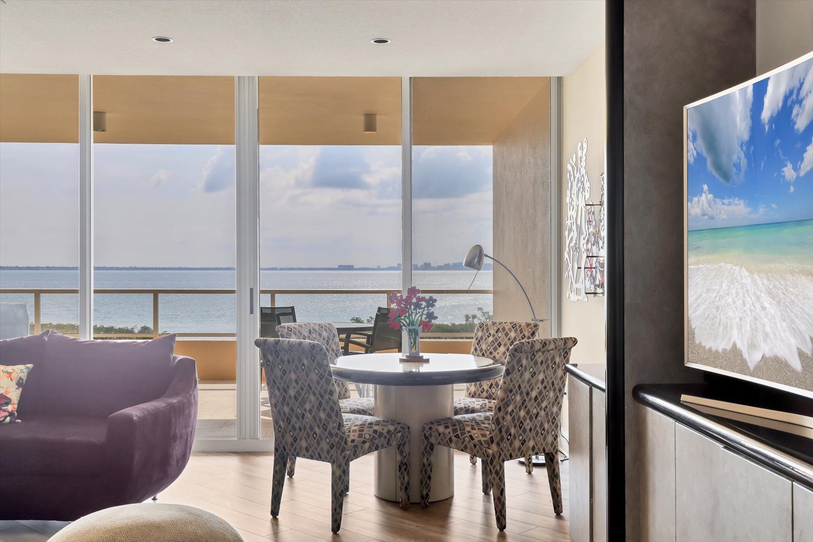 The heart of the home is its modern eat-in kitchen, filled with natural light and perfect for casual dining. When it’s time to entertain, gather in the formal dining room, complete with a built-in bar that makes hosting fun and effortless. Floor-to-ceiling windows bring the outdoors in, while sliding doors connect you to more than 700 square feet of private terrace space, ideal for morning coffee overlooking Sarasota Bay or evening cocktails at sunset.