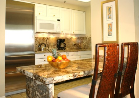 The fully equipped kitchen is as functional as it is beautiful, featuring sleek cabinetry, granite countertops, stainless-steel appliances, and stylish lighting. Dine indoors at the granite table for four or step out to the lanai, where a second dining table and a chaise lounge invite you to relax and unwind.