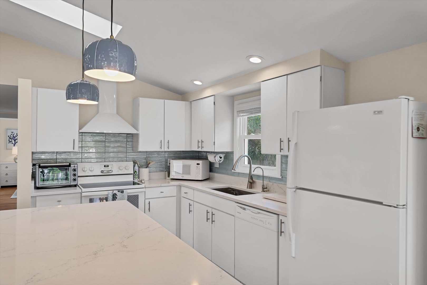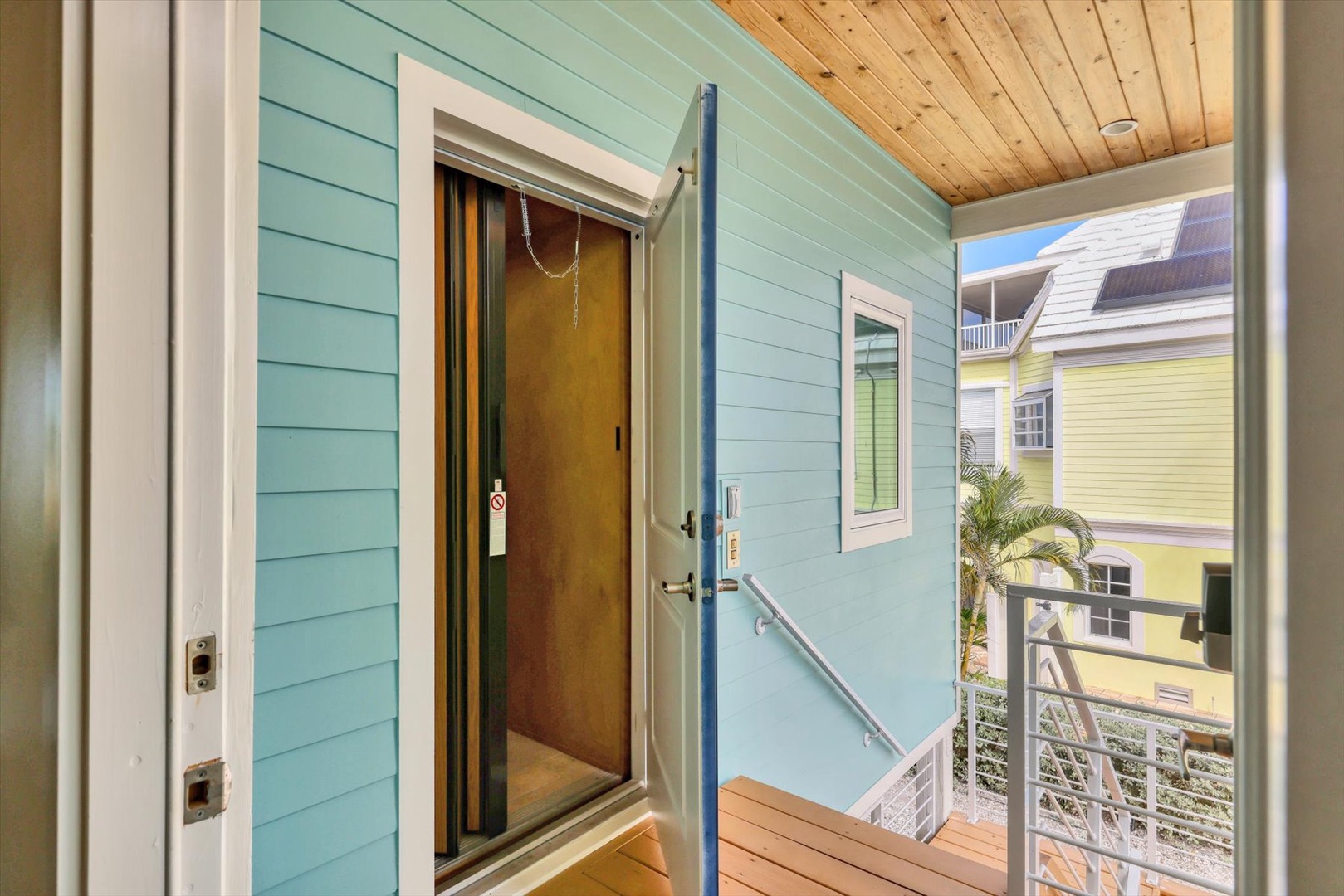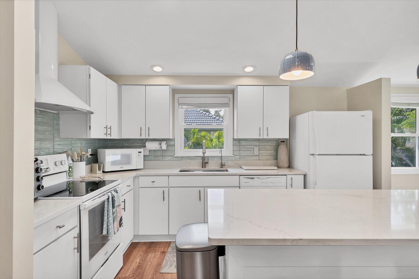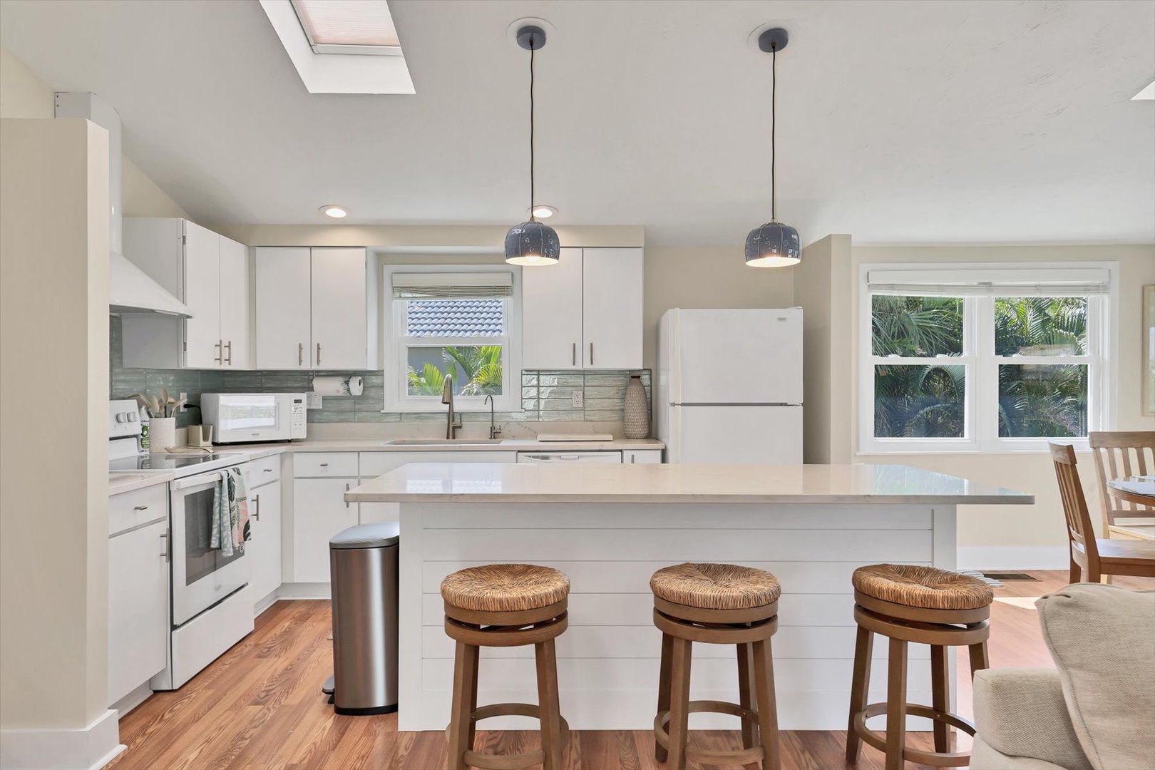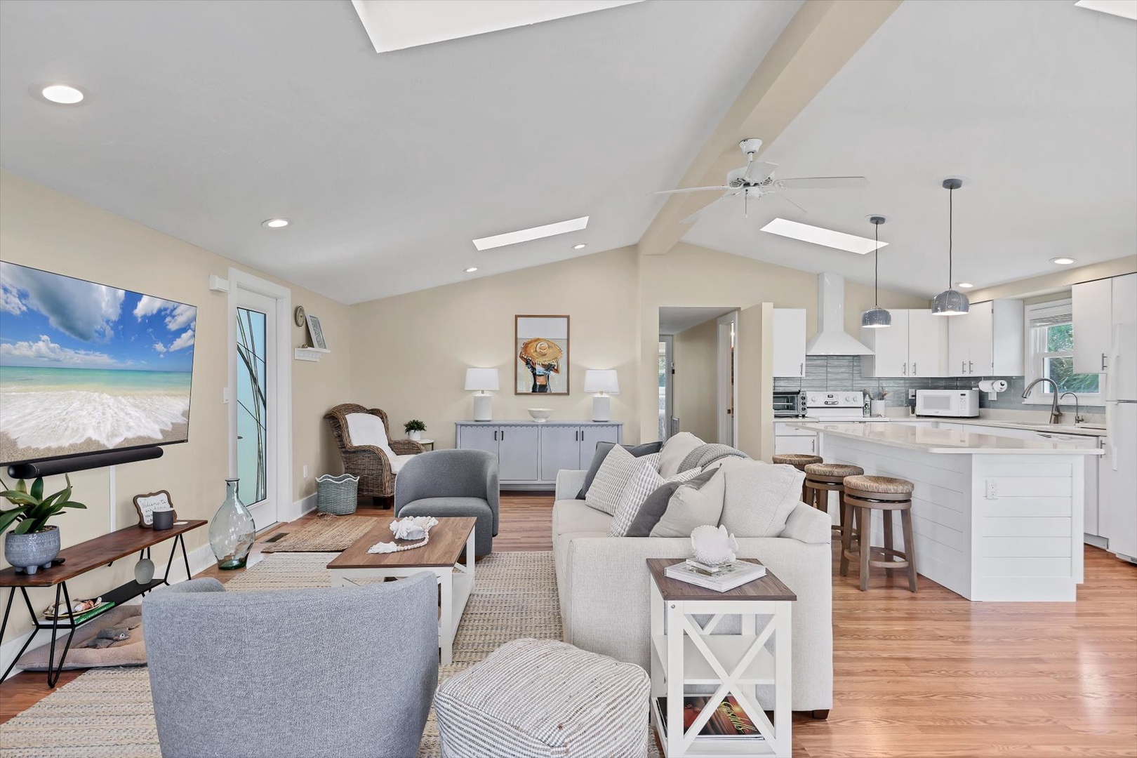 A private elevator provides easy access to the open-concept main level, where light-filled living spaces, designer finishes, and coastal décor create an inviting atmosphere. The fully equipped kitchen features sleek cabinetry, stainless appliances, and an island perfect for gathering and entertaining.