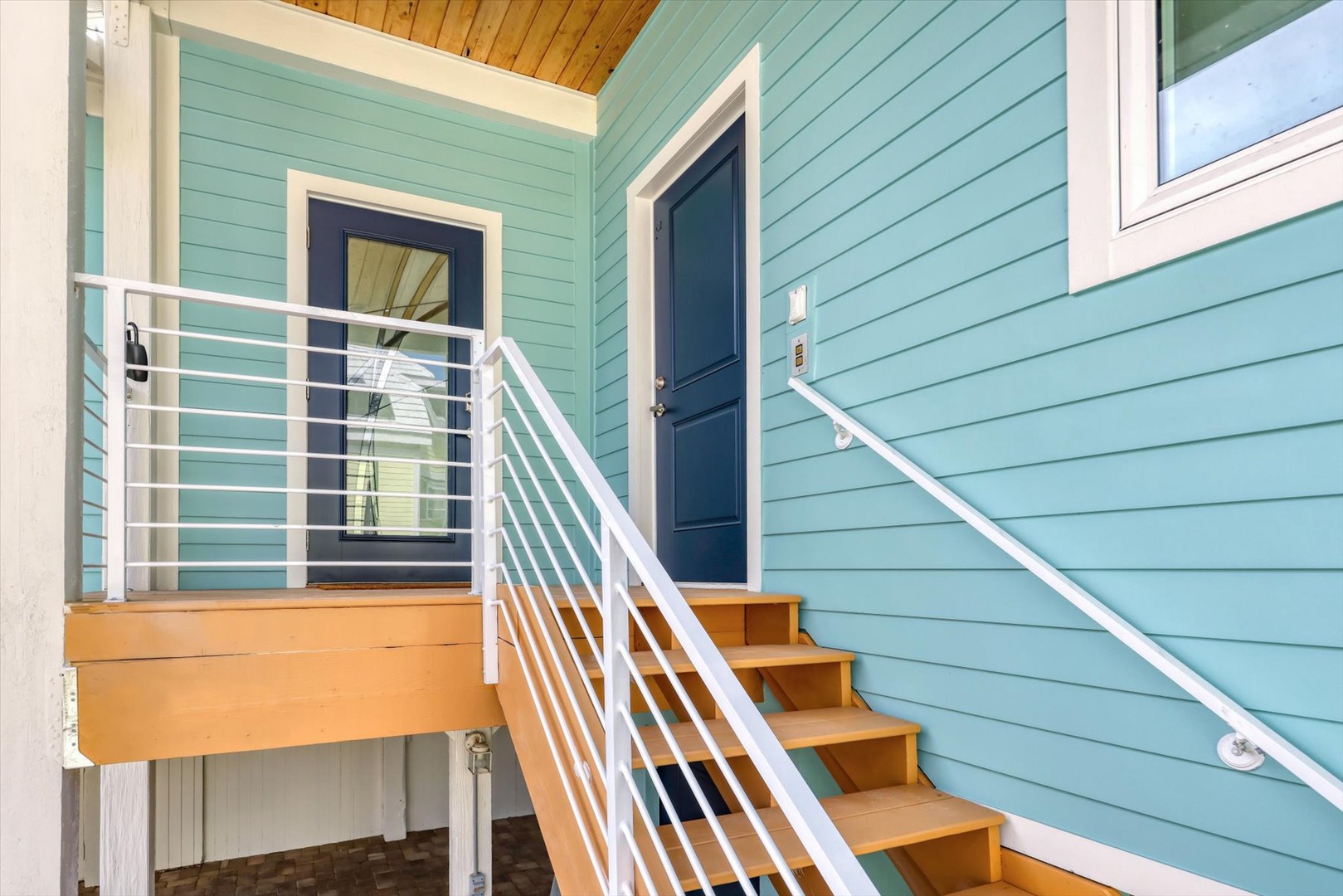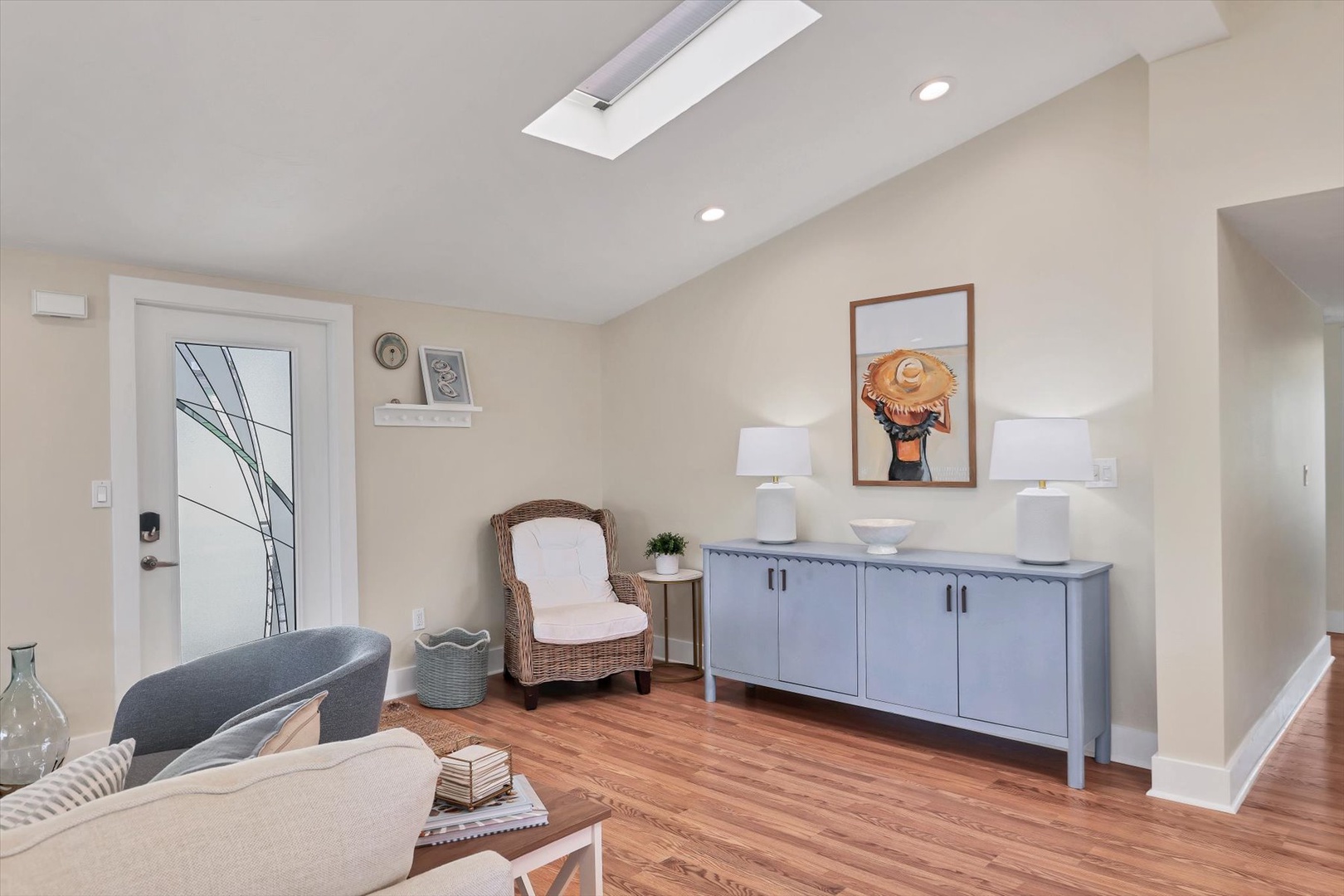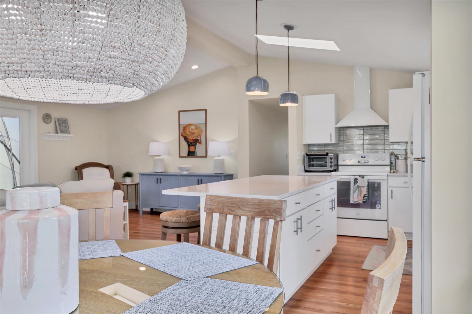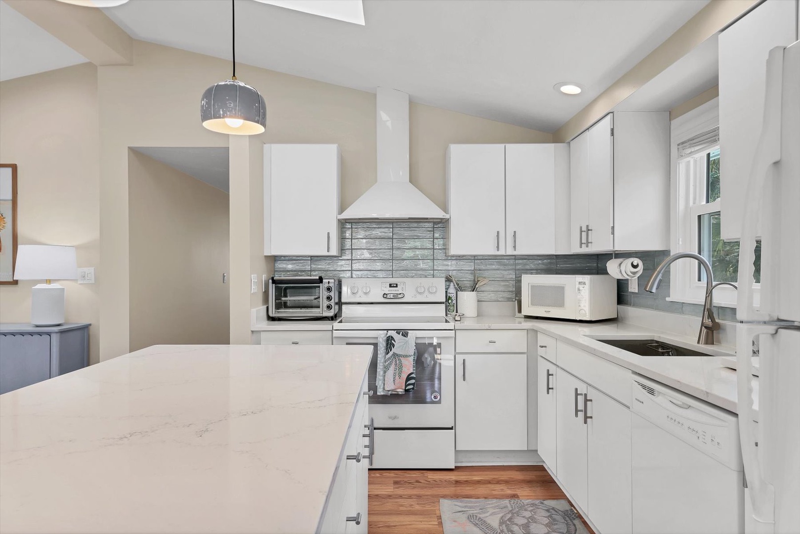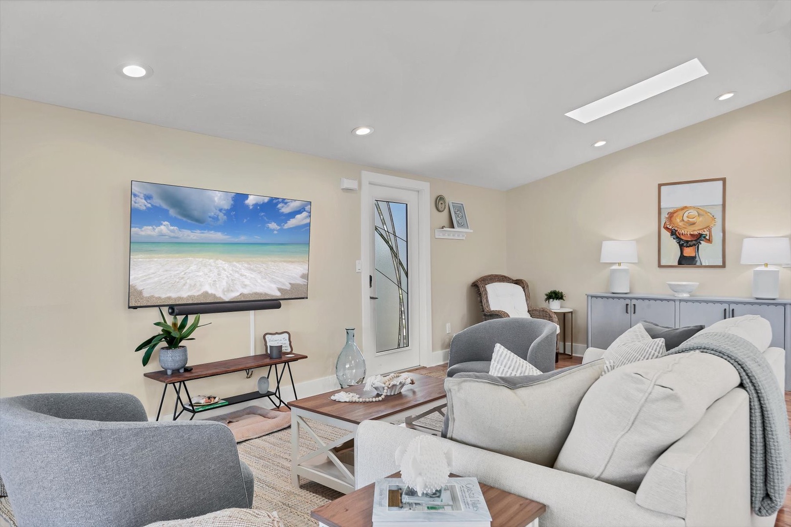 A private elevator provides easy access to the open-concept main level, where light-filled living spaces, designer finishes, and coastal décor create an inviting atmosphere. The fully equipped kitchen features sleek cabinetry, stainless appliances, and an island perfect for gathering and entertaining.