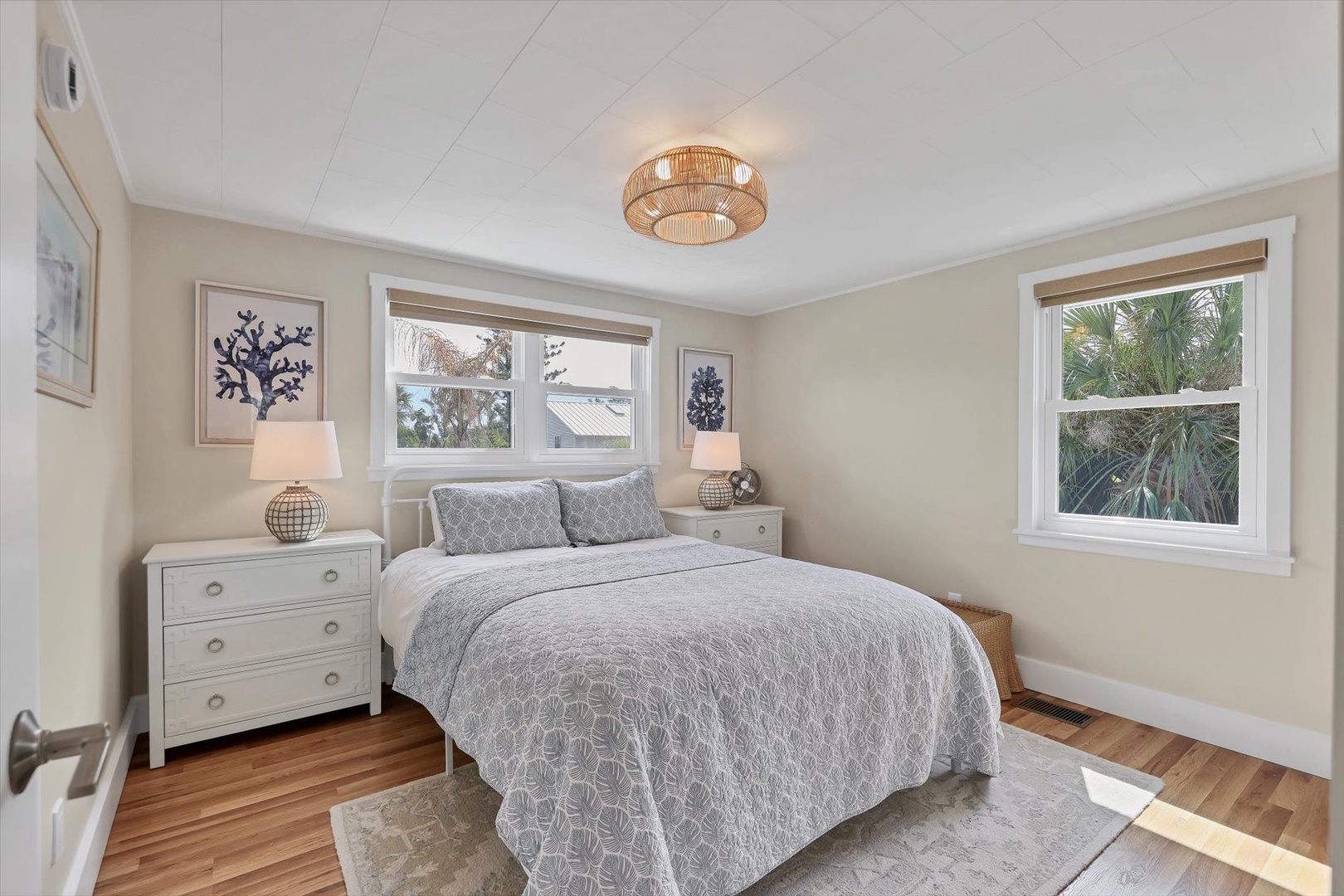 The primary suite offers a king bed, a spa-inspired en-suite bath, and direct access to outdoor spaces. The guest suite includes a queen bed and its own private bath, while the third bedroom features two twin bunk beds, ideal for children or additional guests.